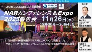全米リアルター協会のカンファレンス&EXPO2025に参加したJARECO及び国際不動産カレッジメンバー能美誠俊さん、池野正樹さんより、現地の様子等のご報告をいただきます。貴重な機会となります。是非御参加ください。